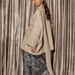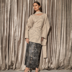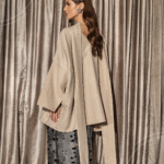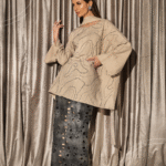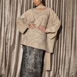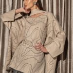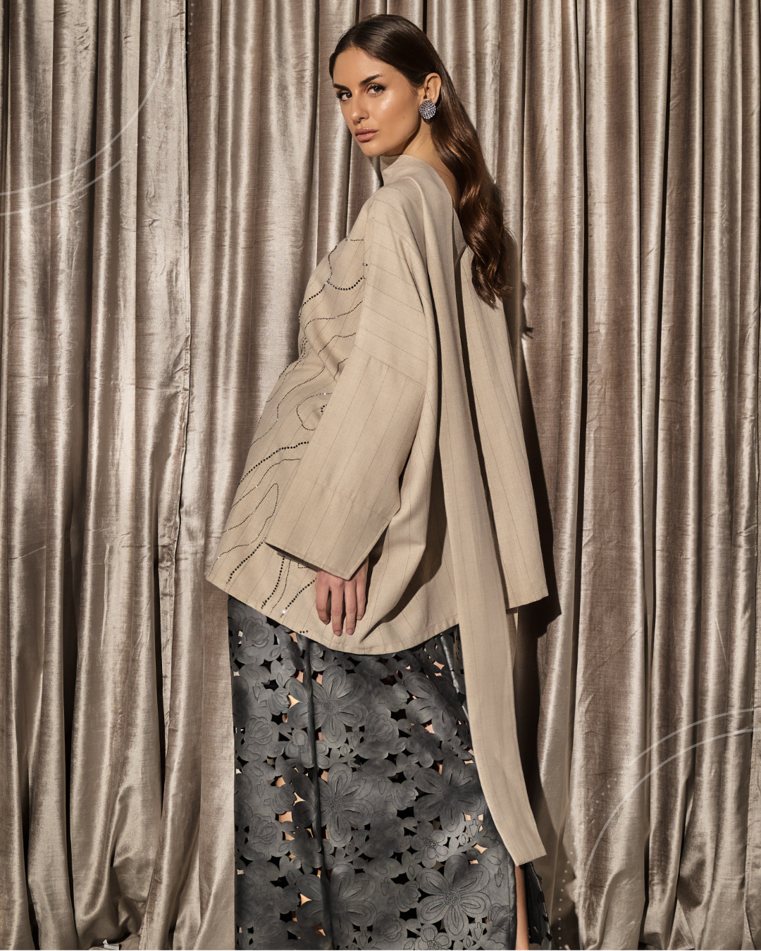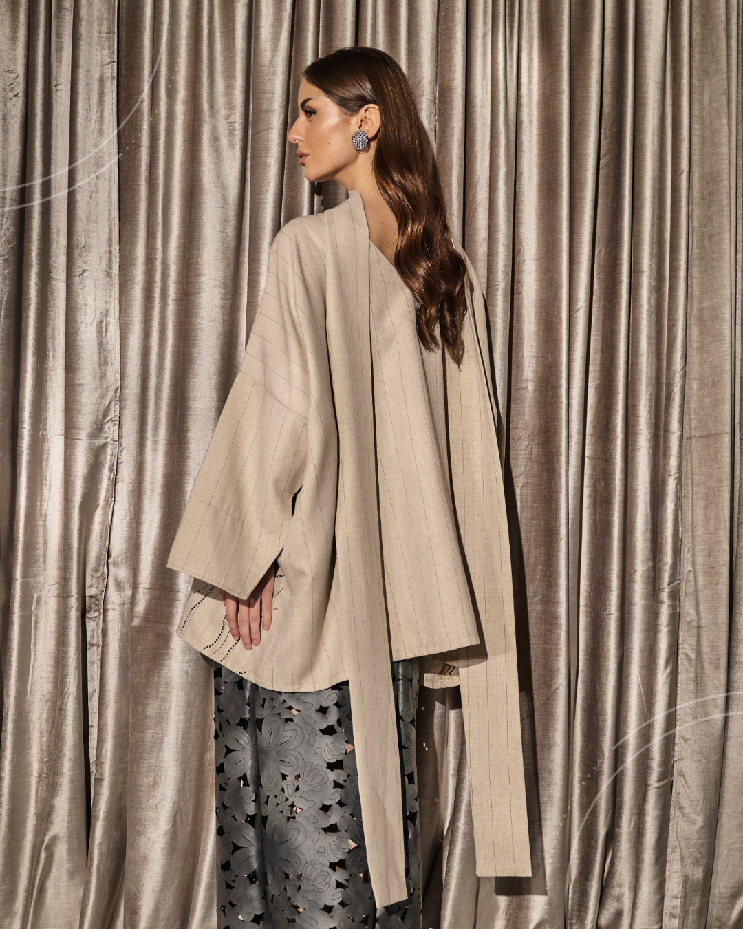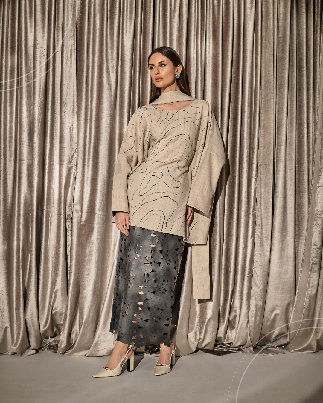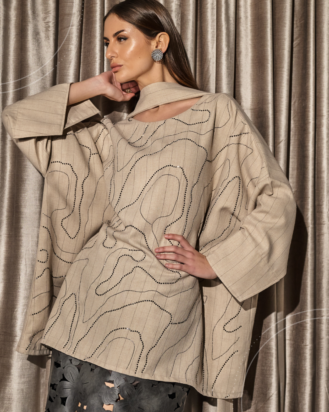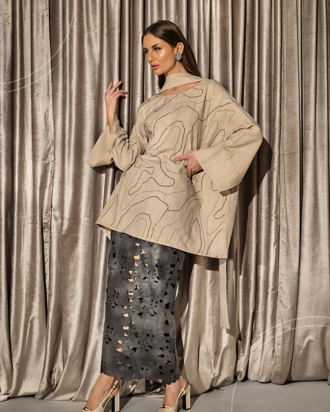 A coordinated set featuring a wide-cut top with a scarf, detailed with subtle crystal detailing in flowing lines,