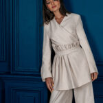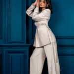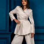 بدله بلون بيج مزينة بلمعة كريستال أنيقة. تتكون من بليزر ربيعي مع بنطلون مريح ، تصميم حصري بقطع محدودة