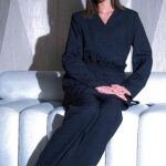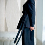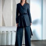 بدلة أنيقة مكونة من بليزر بربطة خصر و بنطلون واسع بقصة عصرية .